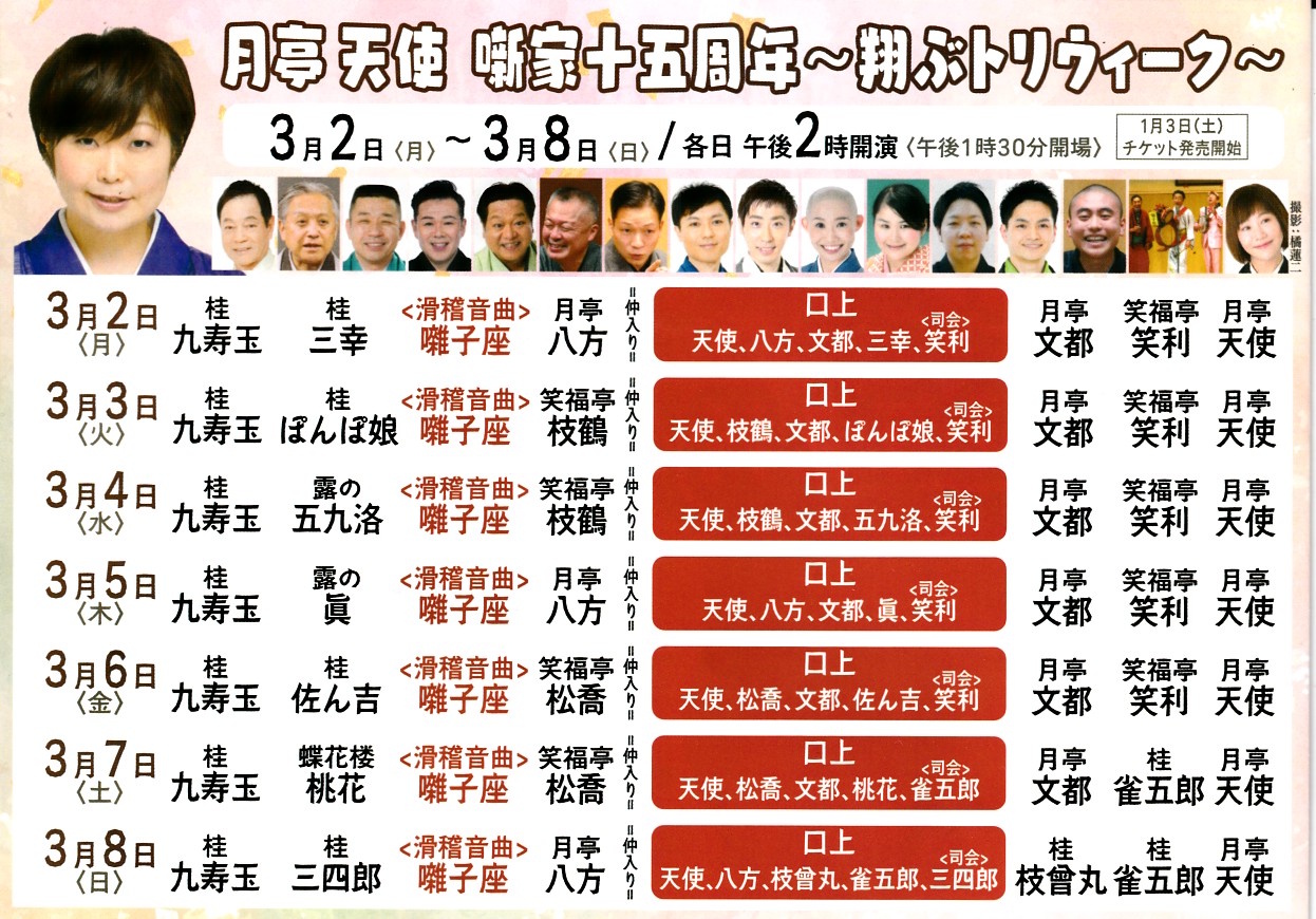 先の投稿でもお知らせしました通り、2月23日から始まる、天満天神繫昌亭昼席出演に続いて、3月2日(月)からは、神戸新開地喜楽館昼席に、囃子座が出演させていただきます。 8日(日)までの7日間「月亭天使 噺家十五周年 翔ぶ[…..]